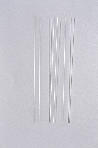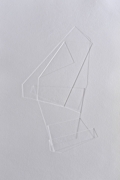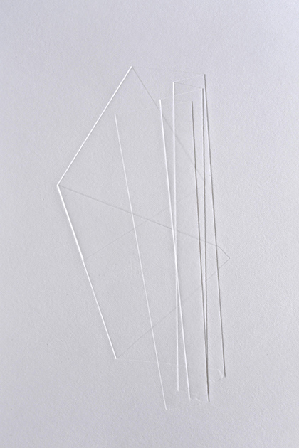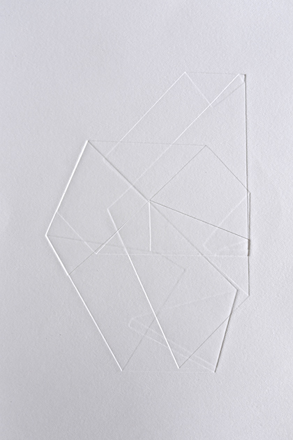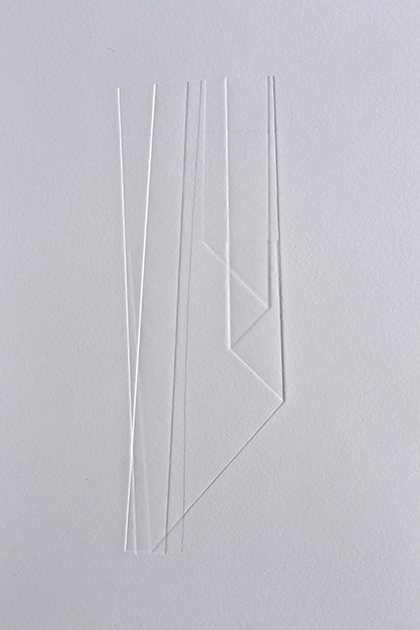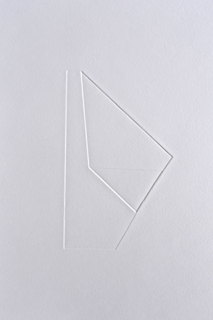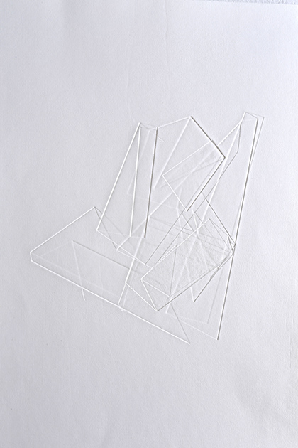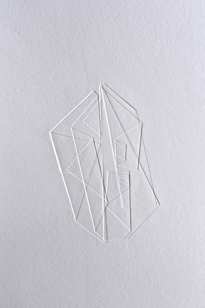 Desde esta posición, utiliza al papel como soporte para el gofrado, el dibujo y la acuarela de nuevos trabajos en donde se vislumbra una nueva aparición de lo corporal, entendido no necesariamente como un objeto que ocupa volumen físico en el espacio, sino en su dimensión proyectual. En este sentido, la capacidad proyectiva de las piezas bidimensionales, atendiendo a las propiedades de escala y tamaño, habilita la dimensión del acto reflejo de una línea en busca de la geometría que ocupa un espacio con características propias y particulares. Lo bidimensional ocupa el espacio sin ser físicamente un volúmen, sino una imagen.