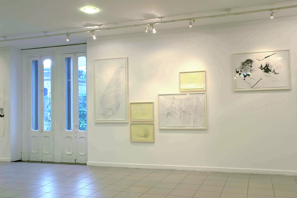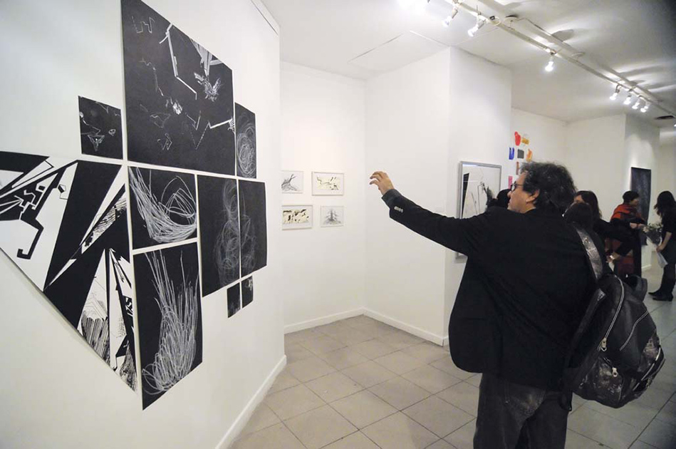 Pero también, y sin traicionarse, puede rozar engañosamente la alusión escénica en sus piezas de formato más francamente horizontal – diríase en scope -, donde la mancha, la línea, la textura, los altos contrastes geométricos de un blanco y negro sonoro y mórbido, y una dinámica de plasticidad más ortodoxa, hablan de un hedonismo para el puro acto de dibujar que quiere, y logra, establecer complicidades, tensiones y resonancias a partir del simulacro de una representación en permanente movimiento, que elude todo el tiempo consolidarse.