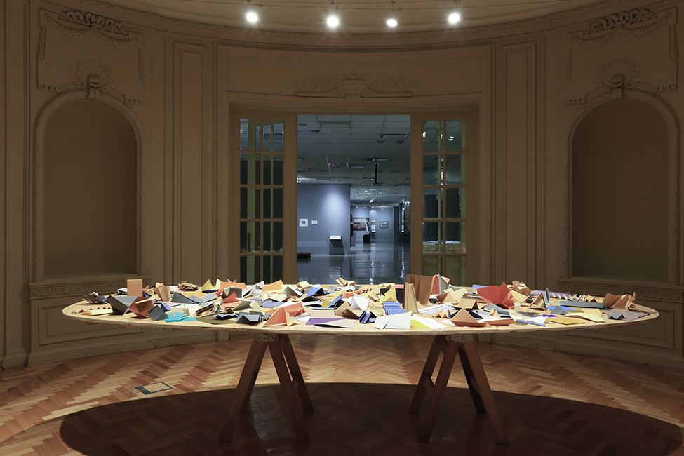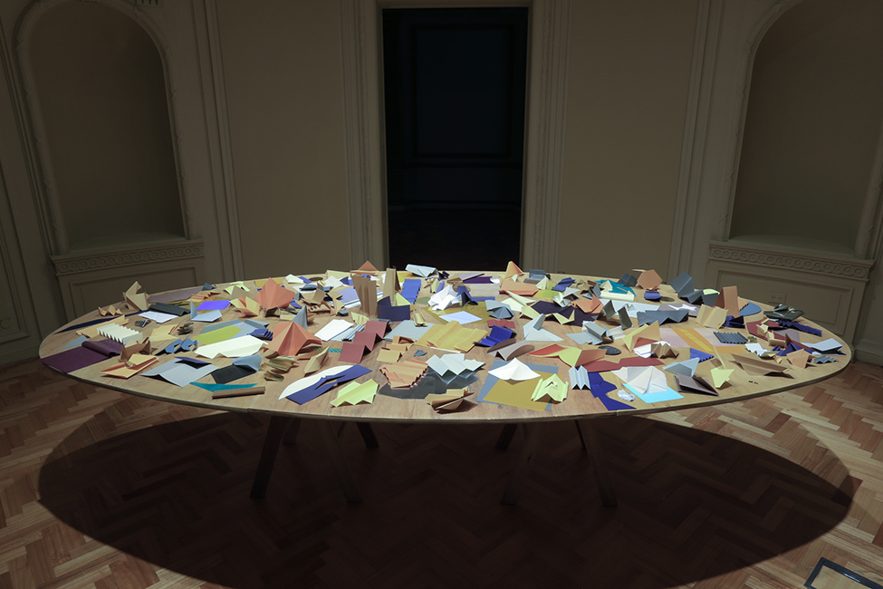 Una colección de papeles de diferentes colores, texturas y formas se ubican sobre una gran mesa, exhibidos. El conjunto aparenta ser vulnerable al cambio y al movimiento como si, de un momento a otro, los papeles pudieran adquirir un nuevo estatuto e integrar otro escenario. La instalación inicia Principio activo - Materia móvil la intervención de Valeria Traversa en “Salitas”, uno de los espacios de la Fundación OSDE que funciona como satélite de la muestra principal.