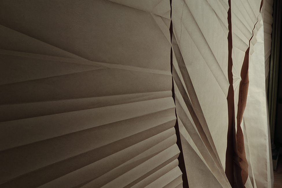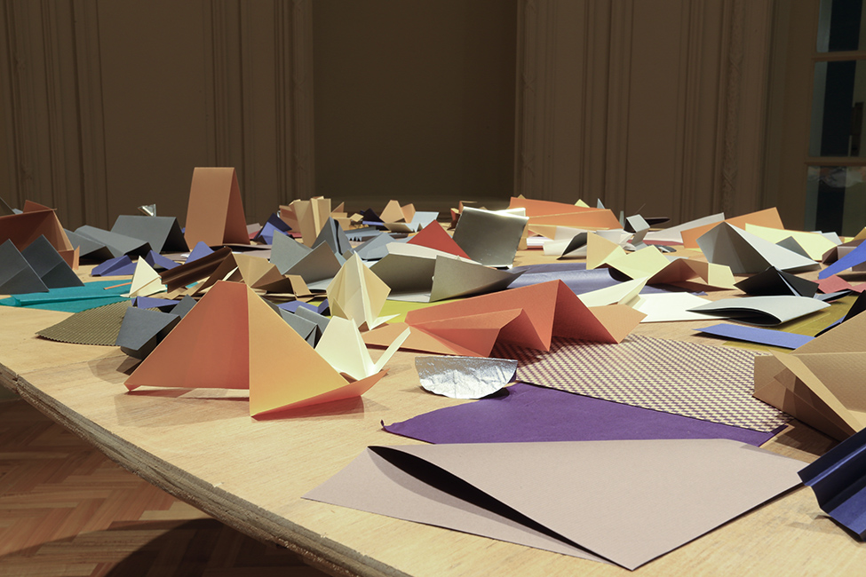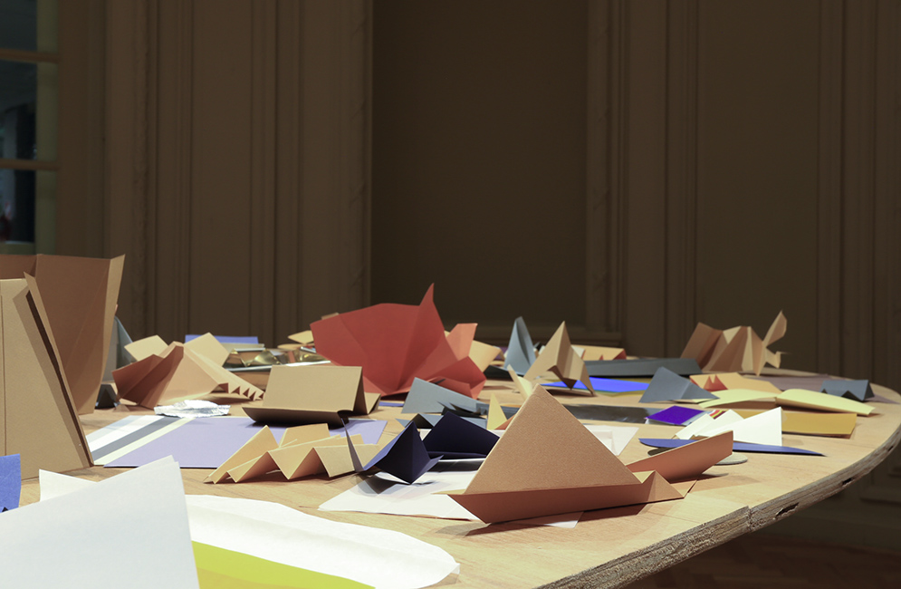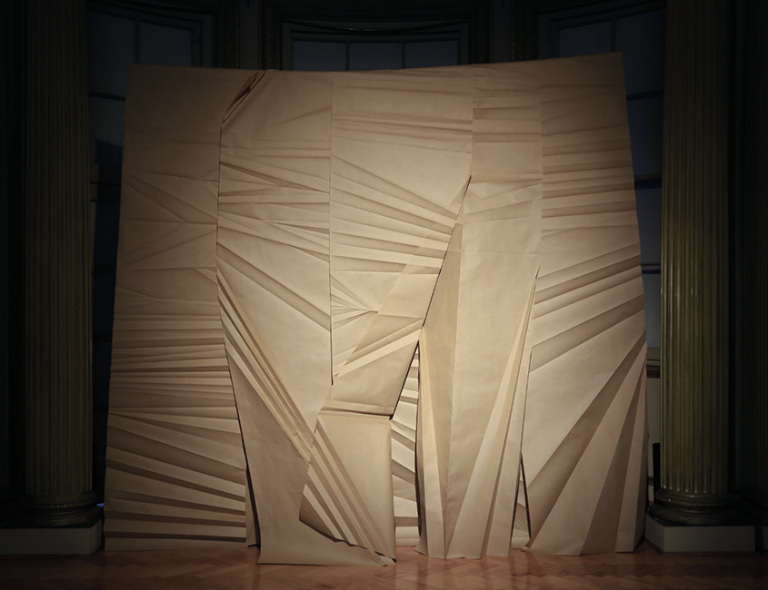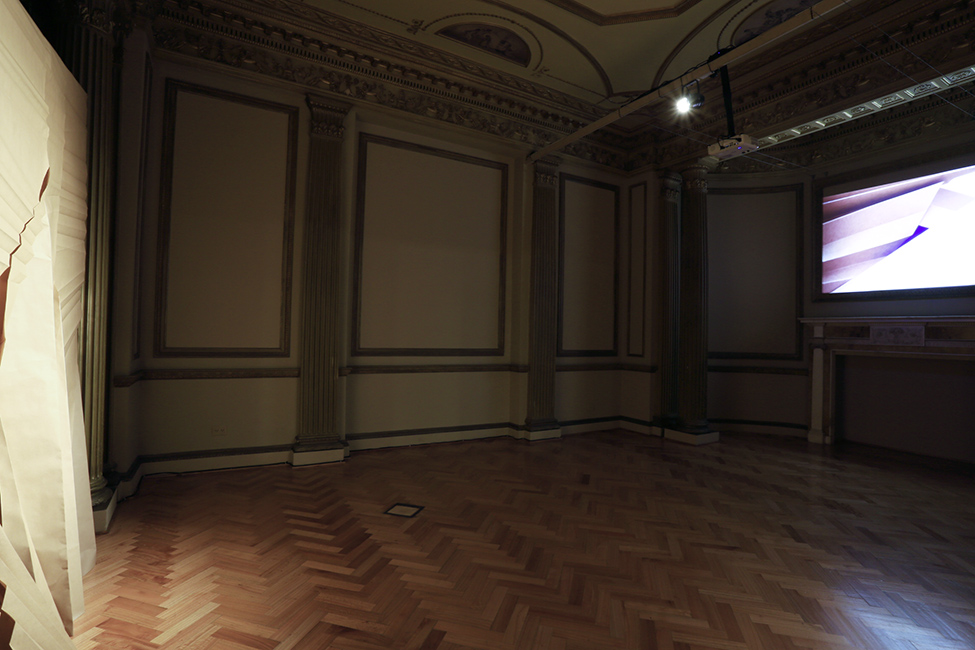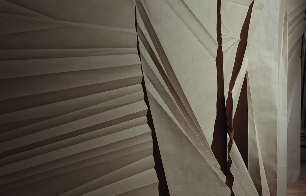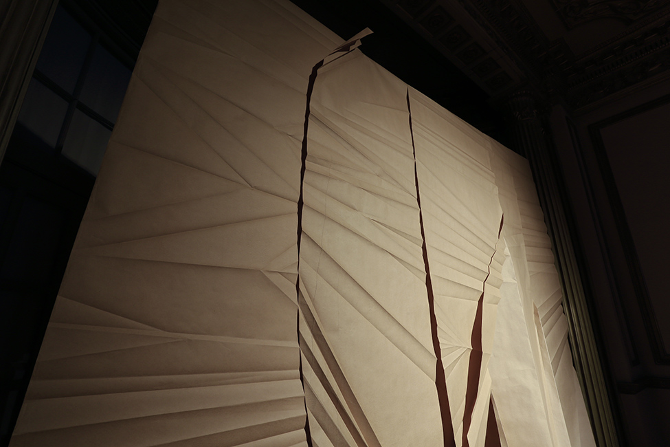 Sumada a la instalación y al video, Valeria Traversa exhibe lo que ya es su signo de identidad: una pared flotante de papeles madera plegados y vueltos a abrir que, en esta oportunidad, se adosan a las columnas de mármol que son parte arquitectura clásica de la sala. En su juntura, la fragilidad del papel y la firmeza del mármol transcriben el contraste de una puesta en escena que apela a constituirse en el ritual de una experiencia permanente que coleccione movimientos, marchas y contramarchas, sobre la superficie del papel.