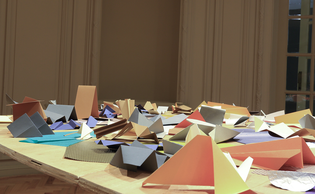 La obra como proceso y el proceso como obra se hacen patentes en el video que acompaña la instalación. La representación del papel es difusa, la forma pierde sustancia y se vuelve actividad sonora con el ruido de los instrumentos sobre el material: cortando, plegando, torciendo. Sin embargo, no hay presencia humana en el registro solamente el efecto que producen los ejercicios físicos sobre el papel. El impulso es acción y avanza hacia delante en un constante ir y venir. En otra oportunidad, Traversa había presentado Dibujo en tránsito, un video en el cual registraba las líneas frenéticas que realizaba sobre unos cuadernos mientras caminaba por la calle. La acción deliberada daba paso a un composición indeterminada que cambiaba con el paso del tiempo. En estos encuentros con el material el pensamiento se vuelve objeto, ejercita el desplazamiento de sí y da como resultado una obra abierta que hace del proceso su principio activo.